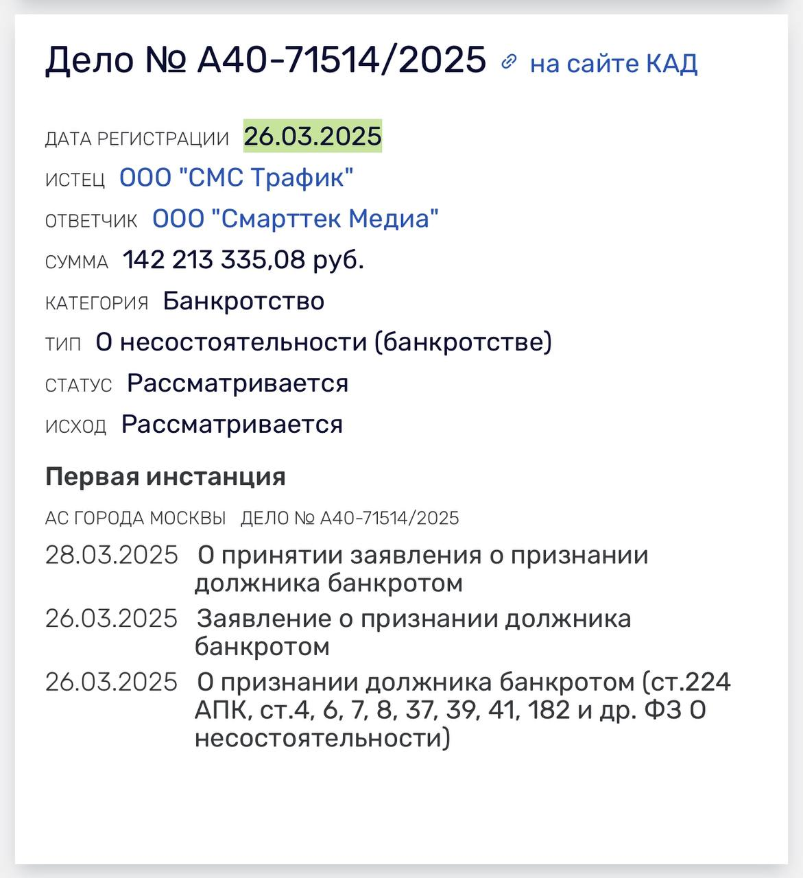 🤓СМС трафик банкротит подрядчика Смарттек Медиа. Согласно карточке суда, объем неисполненных обязательств — 140 миллионов рублей.