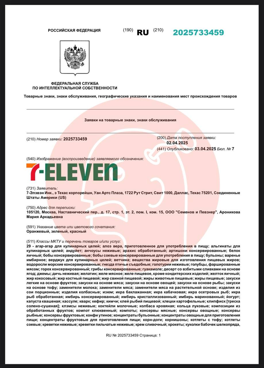 ⚡️Американский Севен Элевен подал заявку на регистрацию товарного знака в российский патентный орган.