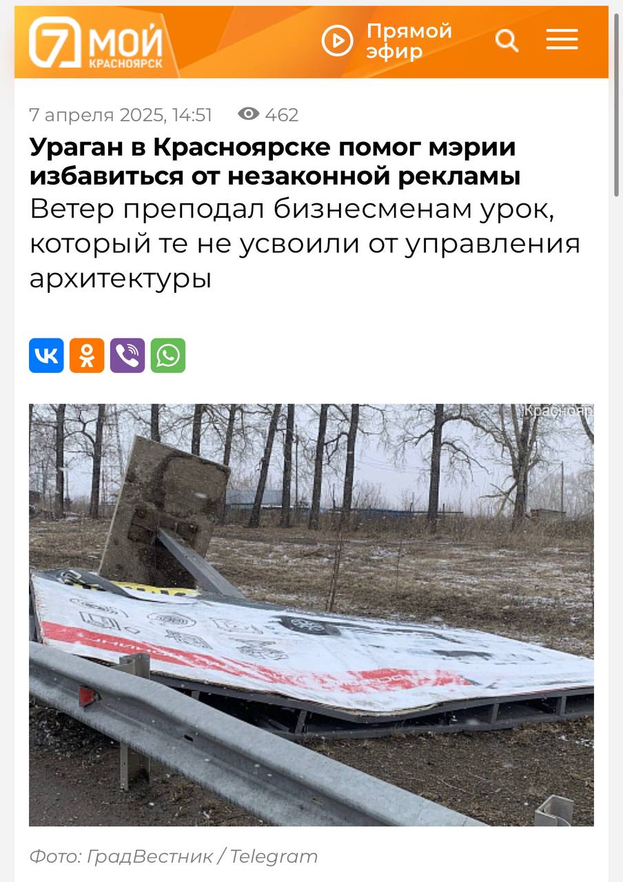 😂Шикарная ситуация в Красноярске. Как мы понимаем из заголовка, население воспринимает за волю небес обрушение незаконных рекламных щитов в городе, с которыми бессильны совладать местные власти.