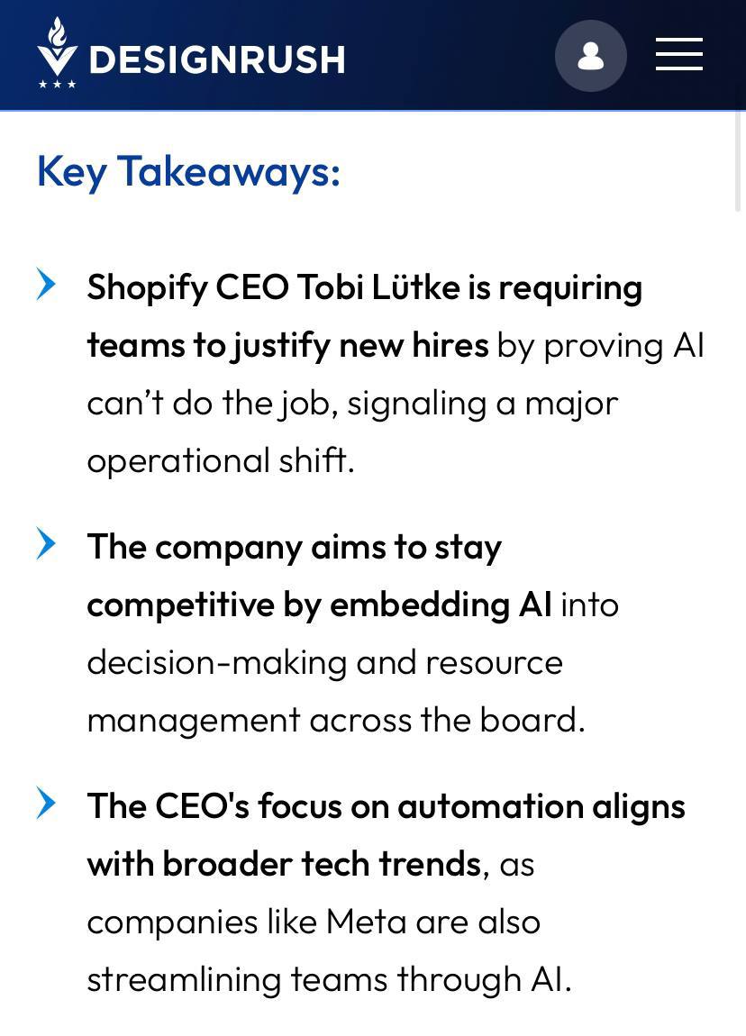🤓Генеральный директор Shopify Тоби Лютке потребовал от руководителей доказывать, почему ИИ не справится с задачей, прежде чем запрашивать найм новых сотрудников или включении их в рабочие команды.