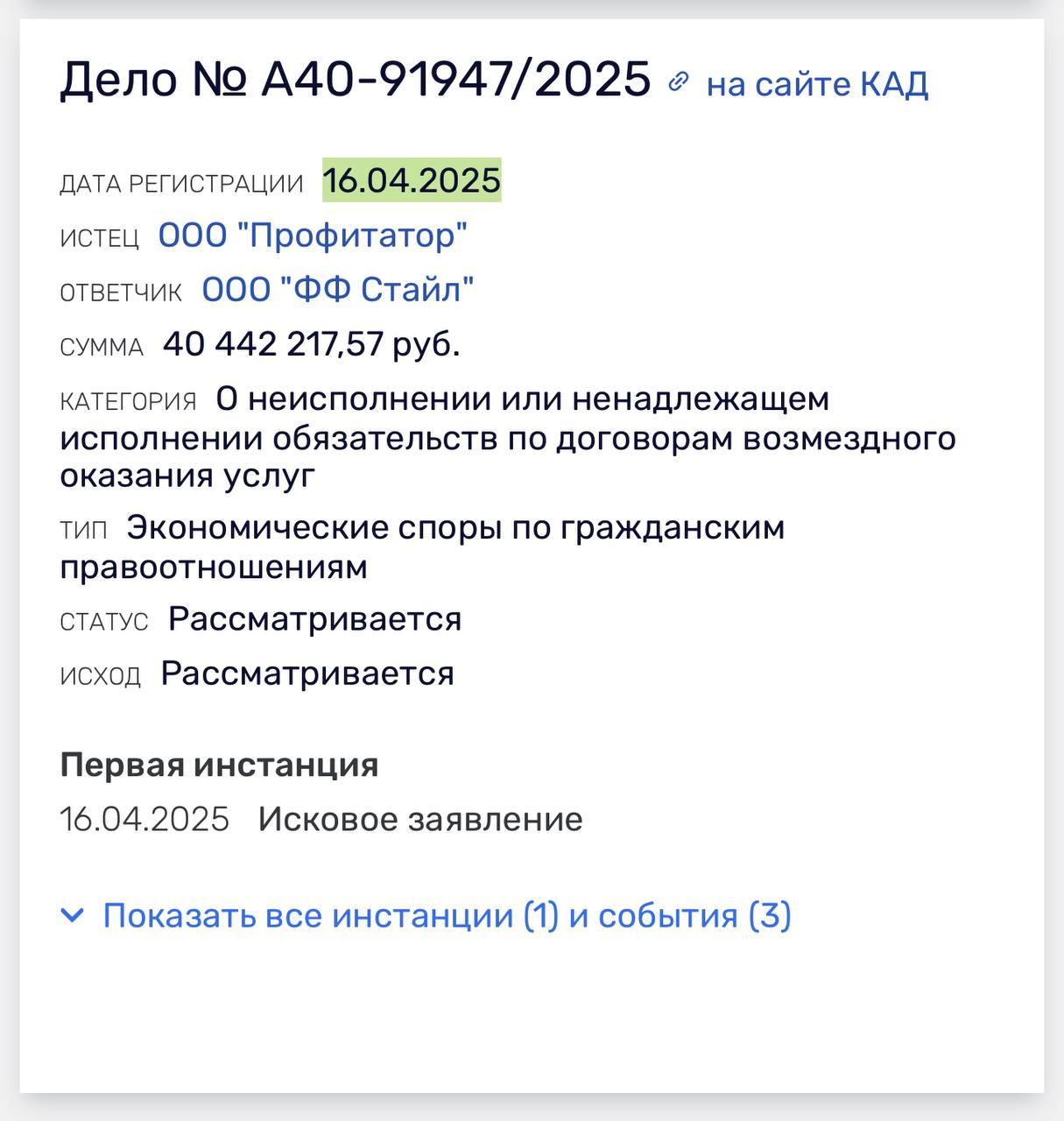 🤓Агентство Профитатор требует с юрлица ритейлера Finn Flare 40 миллионов рублей в суде.