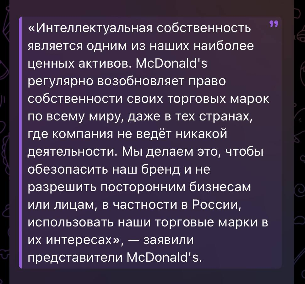 Макдоналдс, слово в слово с нашим текстом, опроверг идею возвращения и объяснил юридической рутиной процедуру перерегистрации товарных марок.