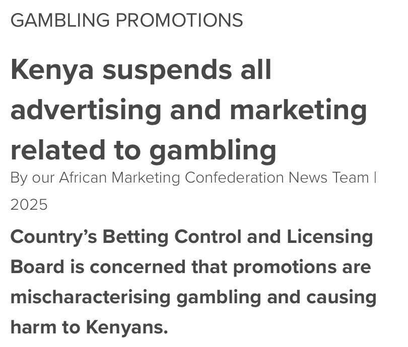 🤓Реклама азартных игр запрещена. Власти Кении блокировали всю рекламу азартных игр на 30 дней на всех платформах, включая телевидение, радио, соцсети и SMS.