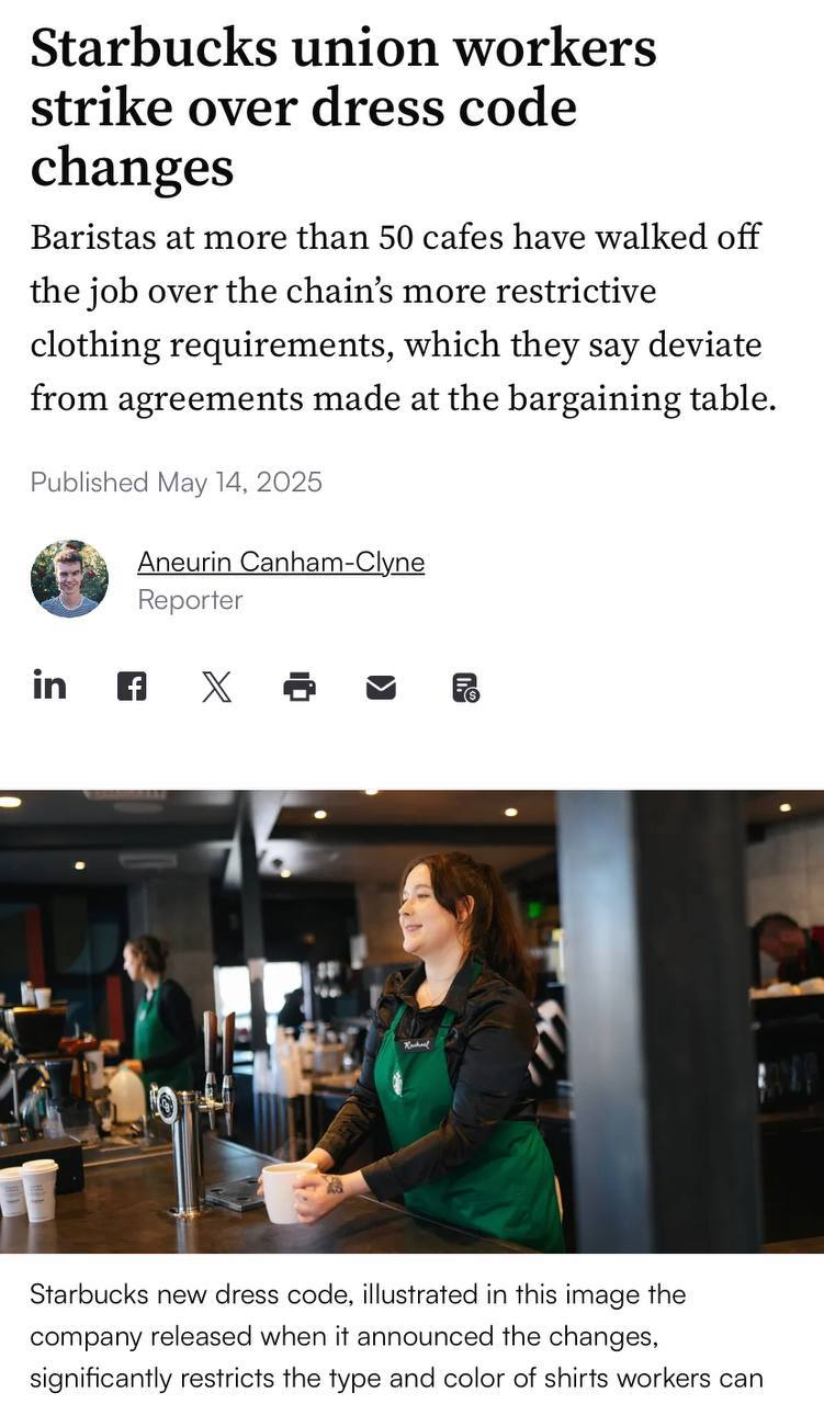 Π Π°Π±ΠΎΡΠ½ΠΈΠΊΠΈ ΠΏΡΠΎΡΡΠΎΡΠ·Π° Starbucks Π±Π°ΡΡΡΡΡ ΡΠΆΠ΅ Π² Π±ΠΎΠ»Π΅Π΅ ΡΠ΅ΠΌ 50 ΠΊΠ°ΡΠ΅ ΠΈΠ·-Π·Π° Π½ΠΎΠ²ΡΡ , Π±ΠΎΠ»Π΅Π΅ ΡΡΡΠΎΠ³ΠΈΡ ΡΡΠ΅Π±ΠΎΠ²Π°Π½ΠΈΠΉ ΠΊ Π΄ΡΠ΅ΡΡ-ΠΊΠΎΠ΄Ρ, ΠΊΠΎΡΠΎΡΡΠ΅, ΠΏΠΎ ΠΈΡ ΠΌΠ½Π΅Π½ΠΈΡ, ΠΏΡΠΎΡΠΈΠ²ΠΎΡΠ΅ΡΠ°Ρ Π΄ΠΎΡΡΠΈΠ³Π½ΡΡΡΠΌ ΡΠ°Π½Π΅Π΅ Π΄ΠΎΠ³ΠΎΠ²ΠΎΡΡΠ½Π½ΠΎΡΡΡΠΌ Ρ ΡΠ°Π±ΠΎΡΠΎΠ΄Π°ΡΠ΅Π»Π΅ΠΌ.