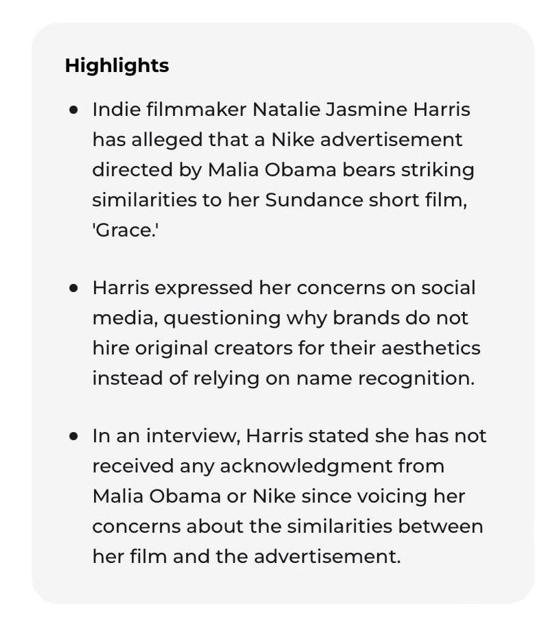 ΠΠ΅Π·Π°Π²ΠΈΡΠΈΠΌΡΠΉ ΡΠ΅ΠΆΠΈΡΡΡΡ ΠΠ°ΡΠ°Π»ΠΈ ΠΠ°ΡΠΌΠΈΠ½ Π₯Π°ΡΡΠΈΡ ΡΠ»ΠΈΡΠΈΠ»Π° ΠΠ°Π»ΠΈΡ ΠΠ±Π°ΠΌΡ, Π² Π·Π°ΠΈΠΌΡΡΠ²ΠΎΠ²Π°Π½ΠΈΠΈ ΠΏΠΎΡΠ»Π΅ Π²ΡΡ ΠΎΠ΄Π° Π΅Ρ ΡΠ΅ΠΊΠ»Π°ΠΌΠ½ΠΎΠ³ΠΎ ΡΠΎΠ»ΠΈΠΊΠ° Π΄Π»Ρ Nike, ΠΊΠΎΡΠΎΡΡΠΉ ΠΏΠΎΡΠ°Π·ΠΈΡΠ΅Π»ΡΠ½ΠΎ ΠΏΠΎΡ ΠΎΠΆ Π½Π° Π΅Ρ ΠΊΠΎΡΠΎΡΠΊΠΎΠΌΠ΅ΡΡΠ°ΠΆΠ½ΡΠΉ ΡΠΈΠ»ΡΠΌ «ΠΡΠ΅ΠΉΡ», ΠΏΠΎΠΊΠ°Π·Π°Π½Π½ΡΠΉ Π½Π° ΠΊΠΈΠ½ΠΎΡΠ΅ΡΡΠΈΠ²Π°Π»Π΅ «Π‘Π°Π½Π΄ΡΠ½Ρ».