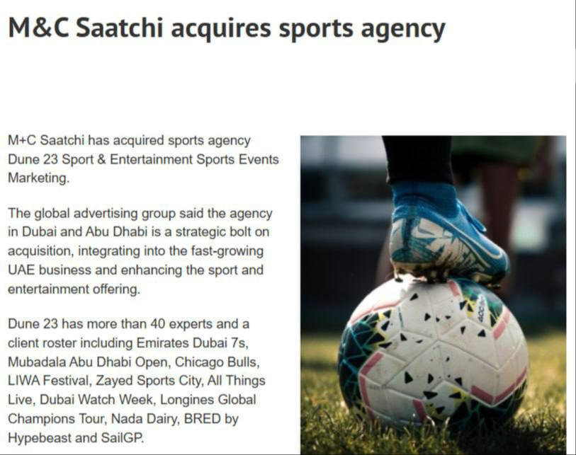 🤔M+C Saatchi приобрела спортивное агентство Dune 23 Sport & Entertainment, базирующееся в Дубае и Абу-Даби, для укрепления позиций на рынке ОАЭ.