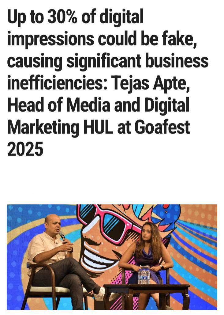 На Goafest 2025 Теджас Апте, руководитель отдела медиа и цифрового маркетинга, из Hindustan Unilever встревожил всех своим заявлением,что до 30% цифровых показов рекламы в Индии могут быть фейковыми.