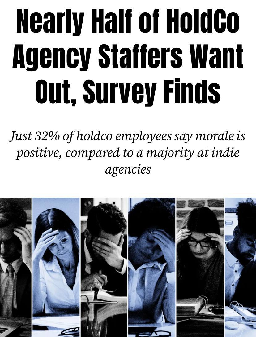 🤓Работа в индустрии рекламы окончательно всех достала. Во всяком случае, в крупнейших мировых холдингах. Согласно опросу Adweek, почти половина сотрудников агентств, входящих в крупные холдинги (таких как WPP, Publicis, Omnicom, IPG, Dentsu и Havas), рассматривают возможность увольнения.