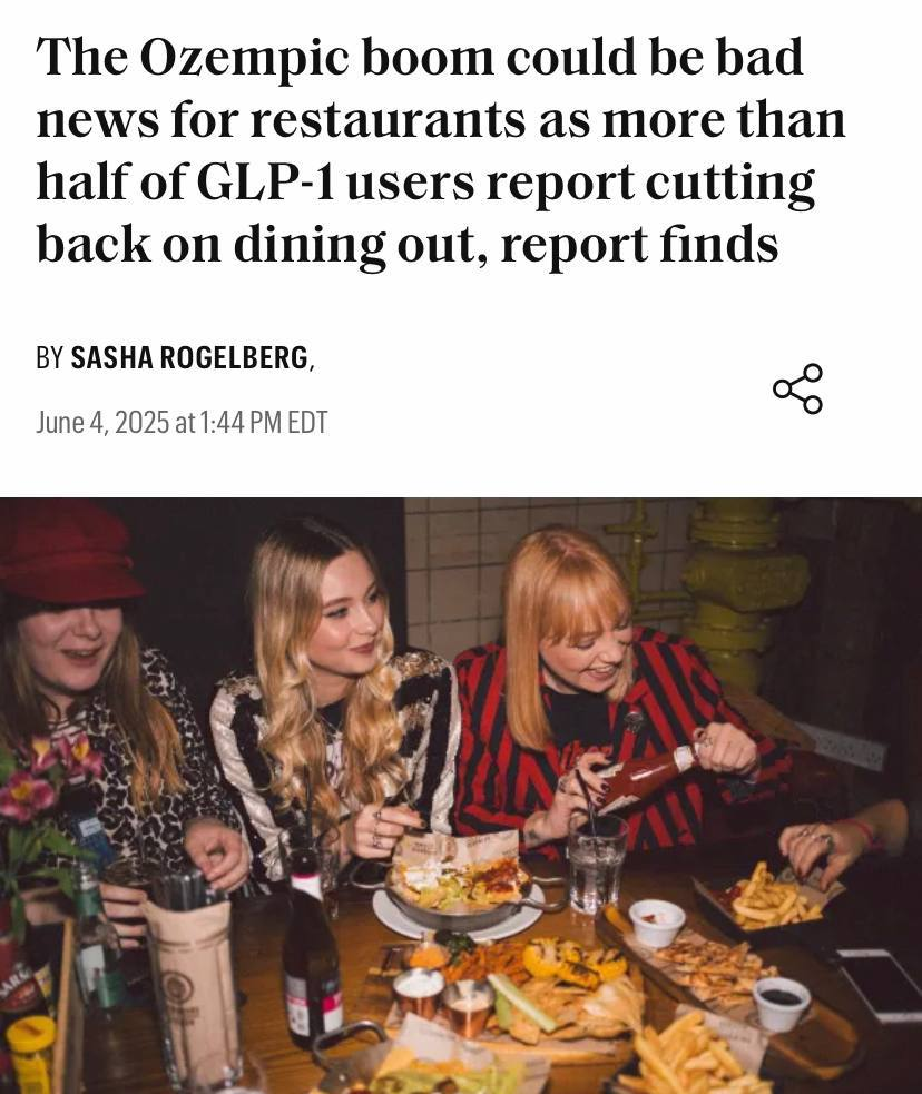 🤓Рестораторы и продавцы готовой еды терпят убытки, Согласно отчету Bloomberg Intelligence, 54% потребителей препаратов GLP-1, таких как Ozempic и Wegovy, стали питаться вне дома, и почти столько же — реже заказывают еду на вынос.
