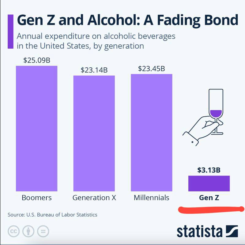 🤓Кажется, на потребительскую арену вышло первое здоровое поколение. В США зеды обрушают перспективы бизнеса алкогольных производителей. Напомним, к поколению Z относят людей, родившихся в период примерно с 1997 по 2012 год.