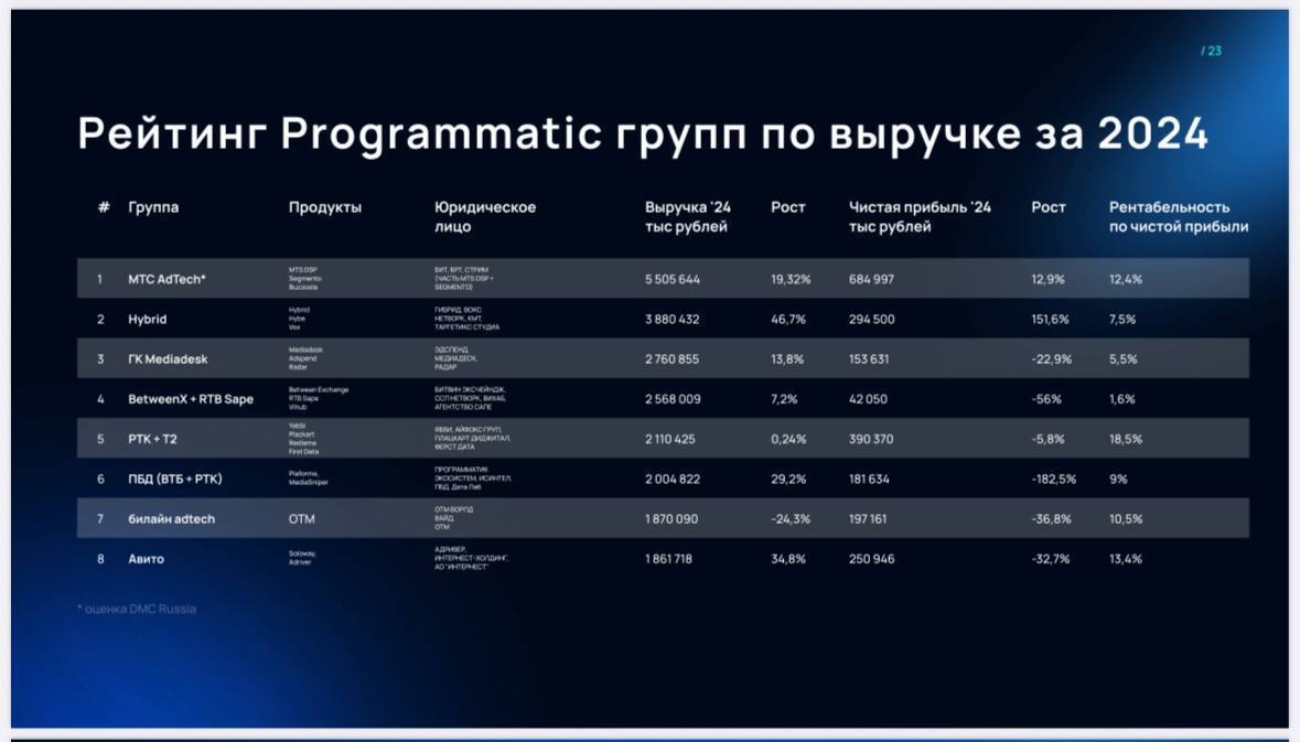 Но что мы только о лидерах. Немного данных в целом по рынку: на нем больше 60 programmatic-продуктов, их общая выручка превысила 47,1 млрд рублей - +21% к 2023 году. Общая чистая прибыль достигла 5 млрд рублей (+27%). Средняя рентабельность - 10,6%.