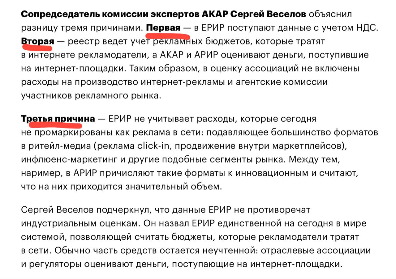 Адпасс подметил, что показатели расходов на интернет-рекламу за 2024 год в отчетах АКАР, АРИР и Роскомнадзора различаются на десятки процентов(‼️).