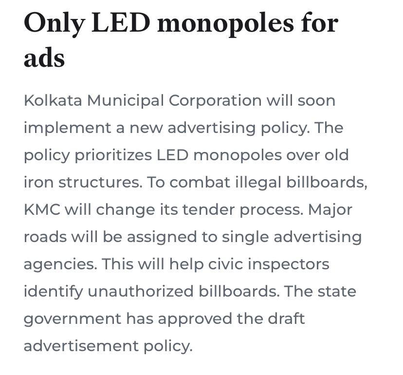 Местное самоуправление индийского города Калькуттаи запретило размещение традиционных рекламных щитов и баннеров, разрешив использовать только светодиодные LED-конструкции.