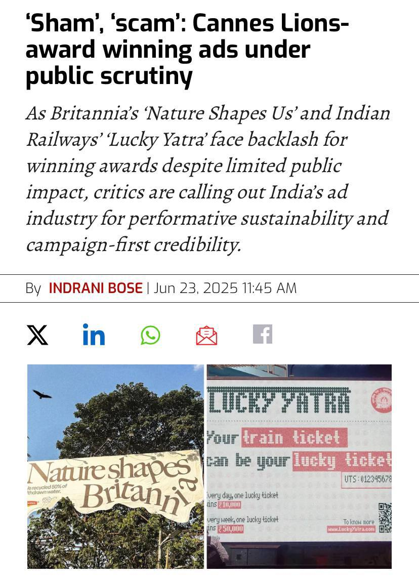 Кампания от Britannia (Индийская многонациональная компания по производству продуктов питания, которая занимается продажей печенья, хлеба и молочных продуктов) «Природа формирует нас», получившая награду в Каннах, подверглась резкой критике после публикации Полины Забродской, которая выявила разрыв между заявленными достижениями в области устойчивого развития и реальными данными из корпоративного отчёта.