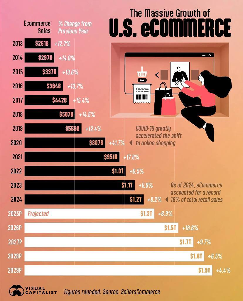 К 2030 году объём e-commerce в США может достичь $2 трлн. Рост ускорился на 40% уже в 2020 году из-за пандемии, когда потребители массово перешли в онлайн.