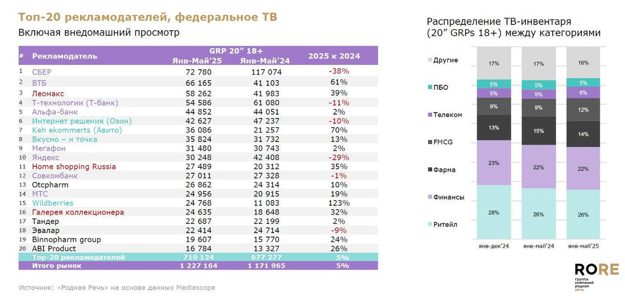 🤔Рекламная активность Сбера на ТВ упала на 38% год к году, а Яндекса на 29%. Кажется, оба снаряда угодили в одну агентскую воронку ОККАМа, что забавно. Не все коту — масленица.