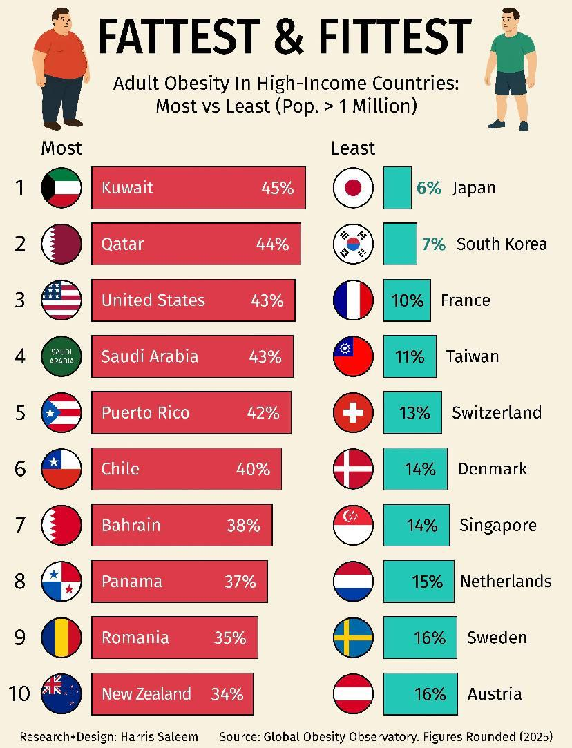🤓Любопытное наблюдение от мировых исследователей. Уровень ожирения не зависит от общего уровня благосостояния в обществе, доступности медицины или числа фитнес-клубов на единицу населения.
