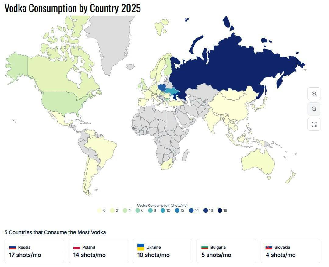 🤓По данным World Population Review Россия лидирует в мировом рейтинге потребления водки. Что не удивительно.
