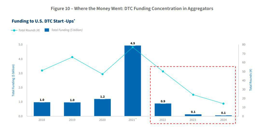 И воторой тревожный факт. Весь пир был за счет инвестиционных бабок в долю будущего пирога. Но после пикового значения в 2021 году финансирование американских DTC-стартапов (direct-to-consumer — компаний, продающих товары напрямую потребителям, минуя посредников) резко сократилось с $4,9 млрд до всего $0,1 млрд в 2023 и 2024 годах, при одновременном снижении количества инвестиционных раундов.