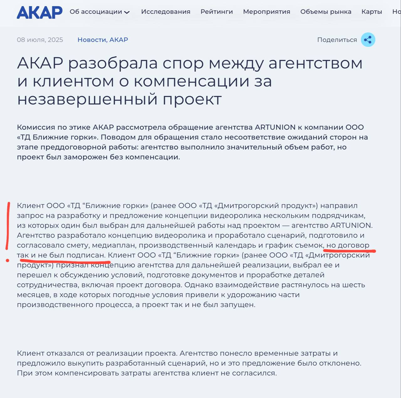 «Даже если проект не реализован, креативная разработка требует оплаты» — а как же законы РФ? Ассоциация формирует какую-то параллельную внезаконную реальность отношений участников рынка рекламы? Зачем плодить нездоровые ожидания участников рынка, что им кто-то должен чего-то без договора?