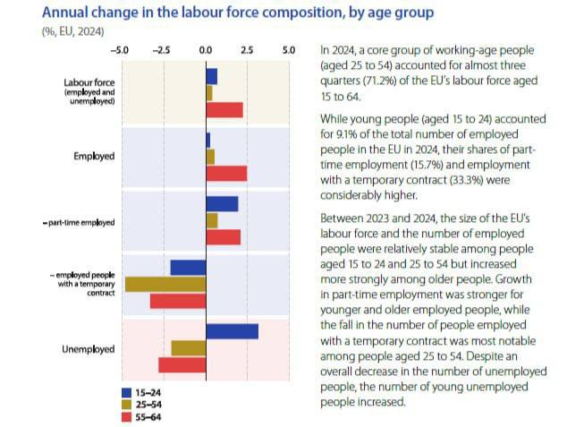 По данным Eurostat, в ЕС больше всего за последнее время выросла рабочая занятость среди людей 55–64 лет, а среди молодёжи (15–24 года) заметно увеличилась доля безработных.