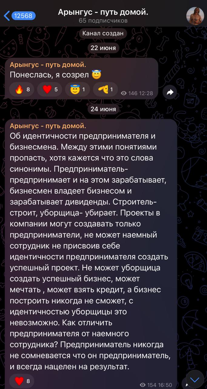 🤓Руководитель агентства Cleantown Media «созрел» и зарегистрировал свой канал в Телеграм. Судя по началу, он будет писать про то как стать предпринимателем, а также освещать вопросы духовного просветления. Возможно, станет чему-то наставлять и коучить (до конца не ясно).