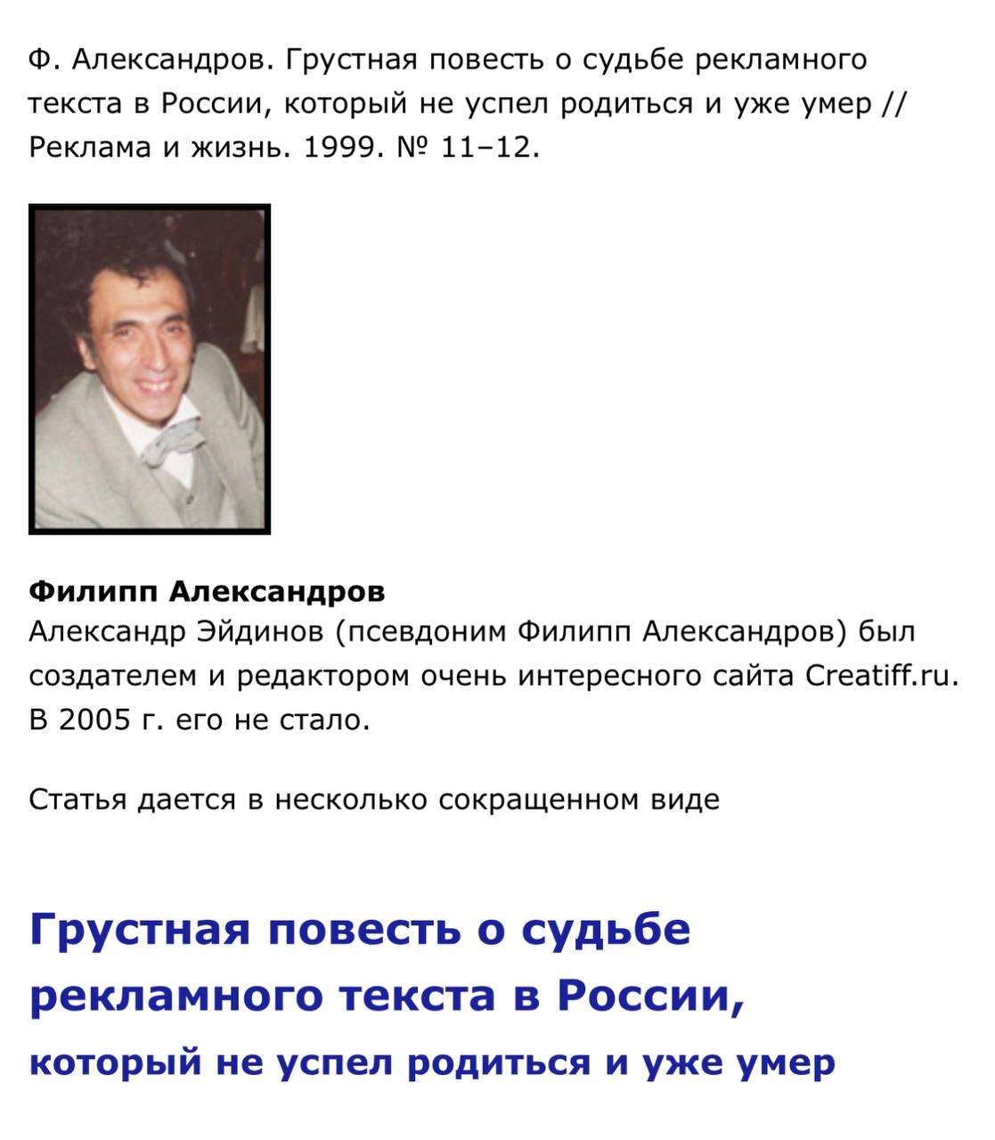 ΠΡ ΡΠΆΠ΅ ΠΏΡΠΈΠΌΠ΅ΡΠ½ΠΎ ΠΏΠΎΠ½ΡΠ»ΠΈ ΠΊΠ°ΠΊΠΈΠΌ Π±ΡΠ» ΠΡΠ΅Π°ΡΠΈΡΡ, Π° ΡΠ΅ΠΏΠ΅ΡΡ ΠΌΡ ΠΏΠΎΠ·Π½Π°ΠΊΠΎΠΌΠΈΠΌ Π²Π°Ρ Ρ Π΅Π³ΠΎ Π°Π²ΡΠΎΡΠΎΠΌ. ΠΠΎΡΡΠΌΠ°ΡΠΊΠ΅ΡΠΈΠ½Π³ Π΄ΠΎΠ±ΡΠ» ΡΡΠ°ΡΡΡ Π€ΠΈΠ»ΠΈΠΏΠΏΠ° Ρ Π½Π°Π·Π²Π°Π½ΠΈΠ΅ΠΌ «ΠΡΡΡΡΠ½Π°Ρ ΠΏΠΎΠ²Π΅ΡΡΡ ΠΎ ΡΡΠ΄ΡΠ±Π΅ ΡΠ΅ΠΊΠ»Π°ΠΌΠ½ΠΎΠ³ΠΎ ΡΠ΅ΠΊΡΡΠ° Π² Π ΠΎΡΡΠΈΠΈ, ΠΊΠΎΡΠΎΡΡΠΉ Π½Π΅ ΡΡΠΏΠ΅Π» ΡΠΎΠ΄ΠΈΡΡΡΡ ΠΈ ΡΠΆΠ΅ ΡΠΌΠ΅Ρ» Π΅ΡΠ΅ Π΄ΠΎΠΊΠ΅Π°ΡΠΈΡΡΠΎΠ²ΡΠΊΠΎΠ³ΠΎ ΠΏΠ΅ΡΠΈΠΎΠ΄Π°.