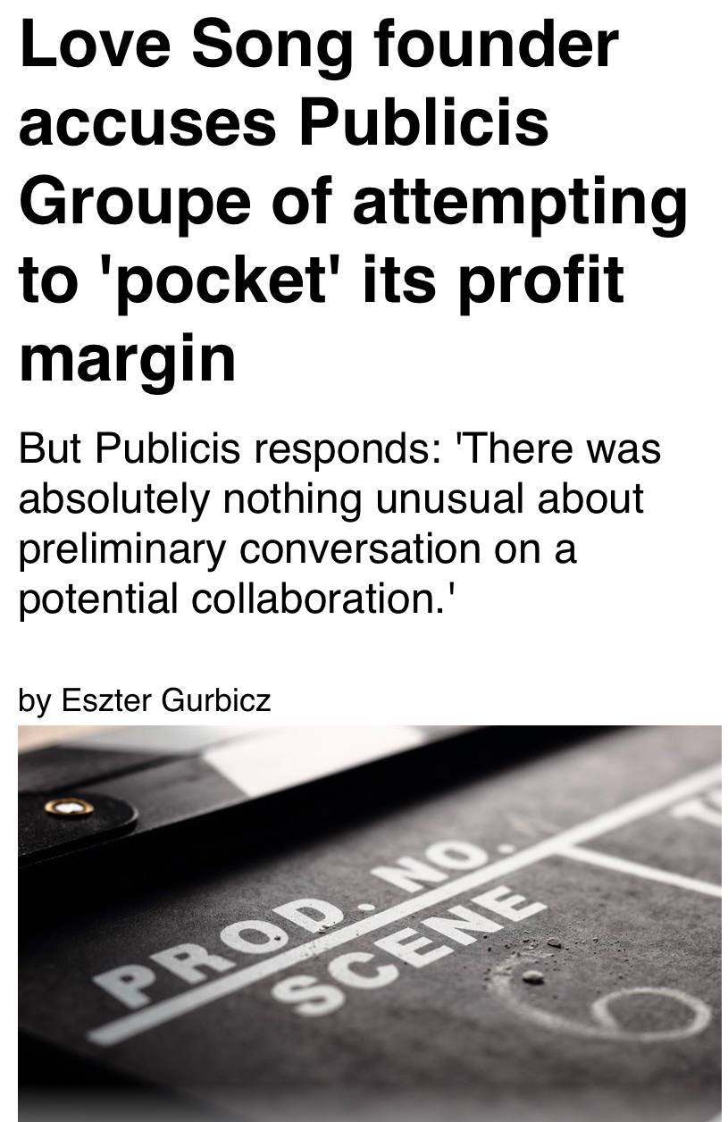 π€Π ΠΠ΅Π»ΠΈΠΊΠΎΠ±ΡΠΈΡΠ°Π½ΠΈΠΈ ΡΠ°Π·Π³ΠΎΡΠ°Π΅ΡΡΡ ΠΈΠ½ΡΠ΅ΡΠ΅ΡΠ½ΡΠΉ ΠΊΠΎΠ½ΡΠ»ΠΈΠΊΡ ΠΌΠ΅ΠΆΠ΄Ρ Π½Π΅Π·Π°Π²ΠΈΡΠΈΠΌΠΎΠΉ ΠΏΡΠΎΠ΄ΡΡΠ΅ΡΡΠΊΠΎΠΉ ΠΊΠΎΠΌΠΏΠ°Π½ΠΈΠ΅ΠΉ Love Song ΠΈ ΡΠ΅ΠΊΠ»Π°ΠΌΠ½ΡΠΌ Ρ ΠΎΠ»Π΄ΠΈΠ½Π³ΠΎΠΌ Publicis Groupe