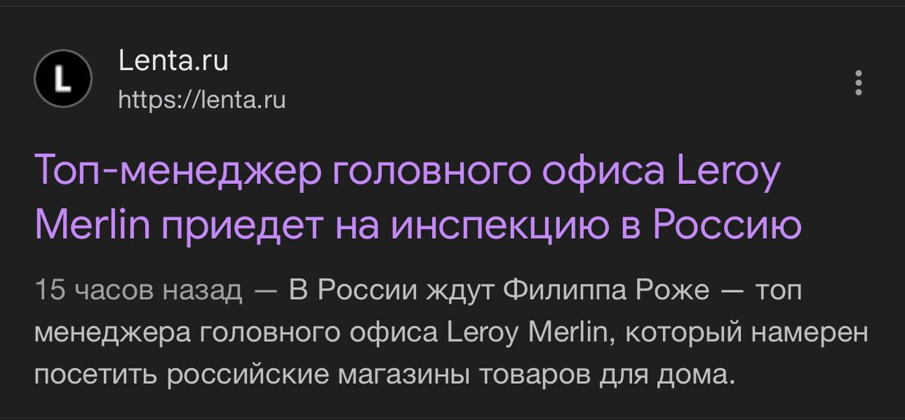 Вчера вечером Лента ру выпустила странную статью с заголовком «Топ-менеджер головного офиса Leroy Merlin приедет на инспекцию в Россию 15 часов назад — В России ждут Филиппа Роже — топ менеджера головного офиса Leroy Merlin, который намерен посетить российские магазины товаров для дома». По словам источника в статье, топ-менеджер намерен «понять обстановку, оценить ситуацию и проанализировать состояние магазинов». Подробности о локациях не раскрываются, но Москва точно значится в маршруте.
