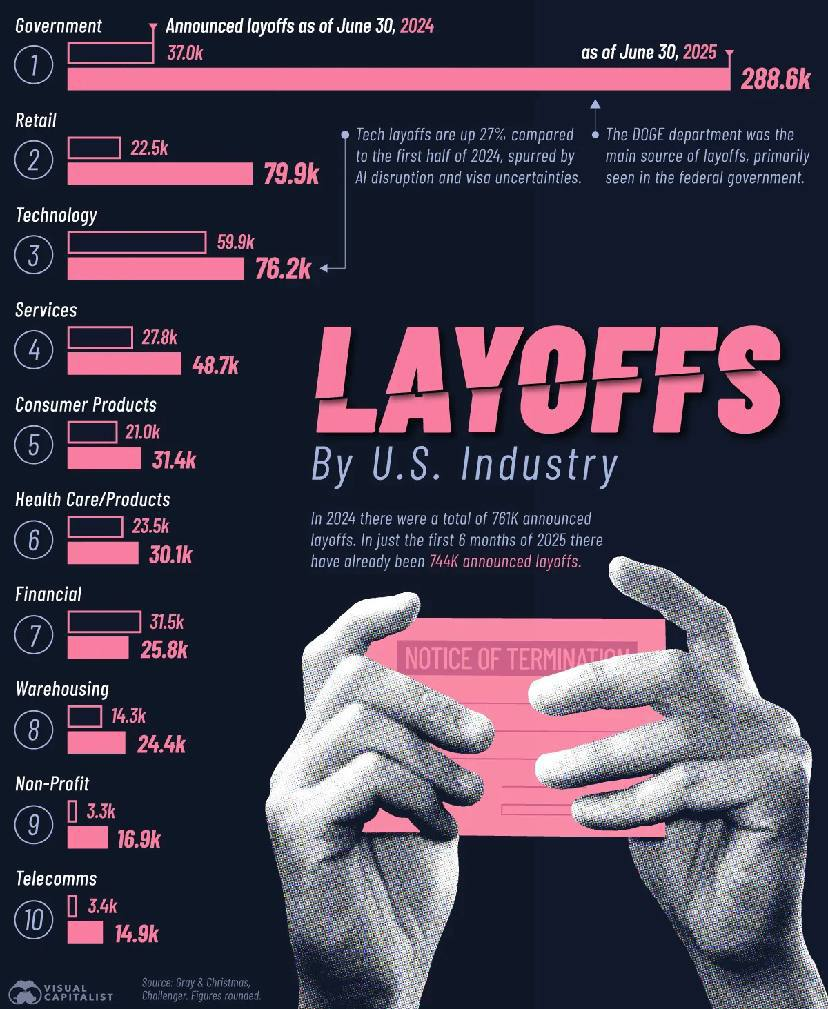 🤔В США за первую половину 2025 года было уволено 761 000 человек, при этом розничная торговля и технологии оказались в числе наиболее пострадавших секторов.