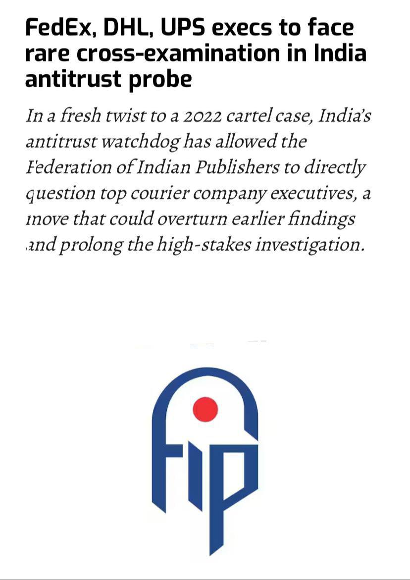 π€Π ΠΠ½Π΄ΠΈΠΈ Π€Π΅Π΄Π΅ΡΠ°ΡΠΈΡ ΠΈΠ½Π΄ΠΈΠΉΡΠΊΠΈΡ ΠΈΠ·Π΄Π°ΡΠ΅Π»Π΅ΠΉ (FIP) ΠΏΠΎΠ»ΡΡΠΈΠ»Π° ΡΠ΅Π΄ΠΊΠΎΠ΅ ΠΏΡΠ°Π²ΠΎ Π½Π°ΠΏΡΡΠΌΡΡ Π΄ΠΎΠΏΡΠΎΡΠΈΡΡ ΡΡΠΊΠΎΠ²ΠΎΠ΄ΠΈΡΠ΅Π»Π΅ΠΉ ΠΊΡΡΠΏΠ½ΡΡ ΠΊΡΡΡΠ΅ΡΡΠΊΠΈΡ ΠΊΠΎΠΌΠΏΠ°Π½ΠΈΠΉ, FedEx, DHL, UPS ΠΈ Aramex, Π² ΡΠ°ΠΌΠΊΠ°Ρ Π°Π½ΡΠΈΠΌΠΎΠ½ΠΎΠΏΠΎΠ»ΡΠ½ΠΎΠ³ΠΎ ΡΠ°ΡΡΠ»Π΅Π΄ΠΎΠ²Π°Π½ΠΈΡ ΠΎ Π²ΠΎΠ·ΠΌΠΎΠΆΠ½ΠΎΠΌ ΡΠ΅Π½ΠΎΠ²ΠΎΠΌ ΡΠ³ΠΎΠ²ΠΎΡΠ΅, Π²ΠΎΠ·Π±ΡΠΆΠ΄Π΅Π½Π½ΠΎΠ³ΠΎ Π² 2022 Π³ΠΎΠ΄Ρ.