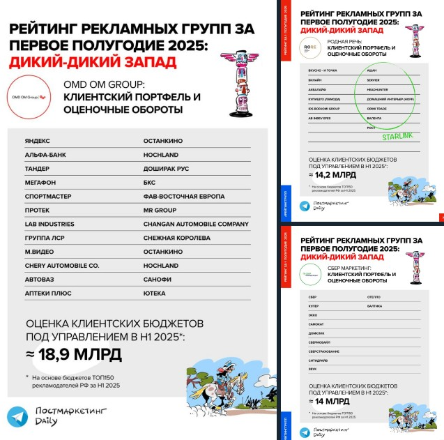 ❕UPD: В Рейтинге Постмаркетинга за первое полугодие дано обновление в клиентских листах и оценке бюджетов OMD OM, а для Сбермаркетинга представлена детализация клиентов в структуре экосистемы Сбер.