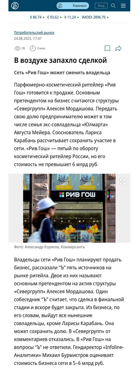 🤓В СМИ пошли новые волны сенсаций по продаже сети Рив Гош. Так или иначе, концы ведут к Мордашову. Но это не точно… Финал может быть самым неожиданным, несмотря на то что пишут журналисты.