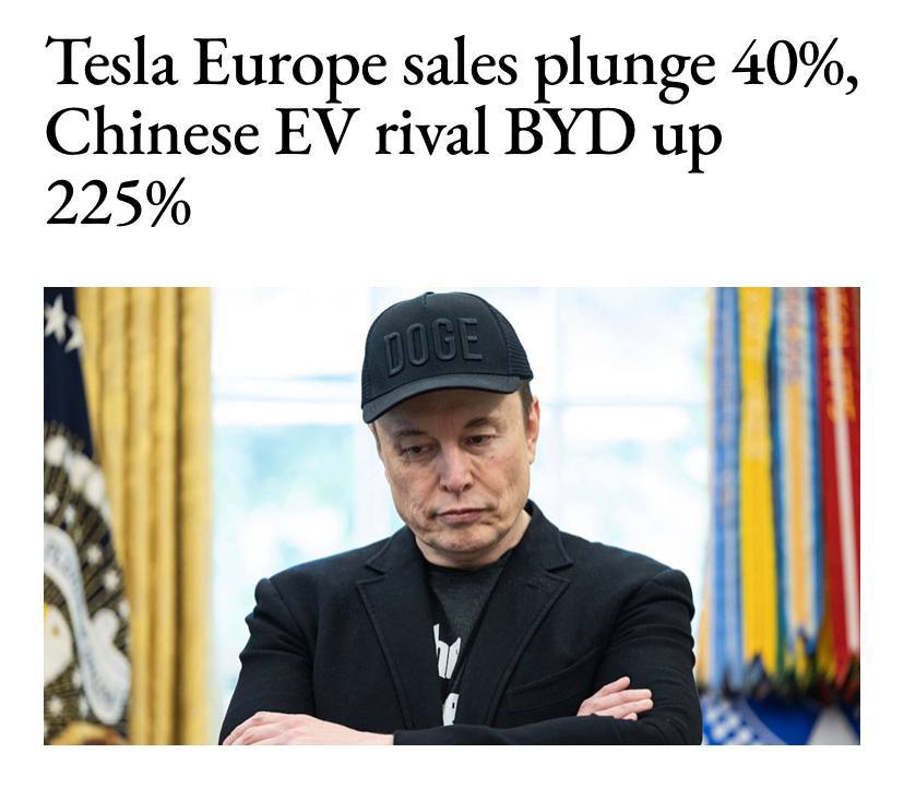 В загнивающей Европе продажи автомобилей Tesla в июле упали на 40 % по сравнению с прошлым годом, составив 8 837 единиц, при этом китайский конкурент BYD зафиксировал рост на 225 %, 13 503 новых регистрации, показывая сильное расширение на европейском рынке.