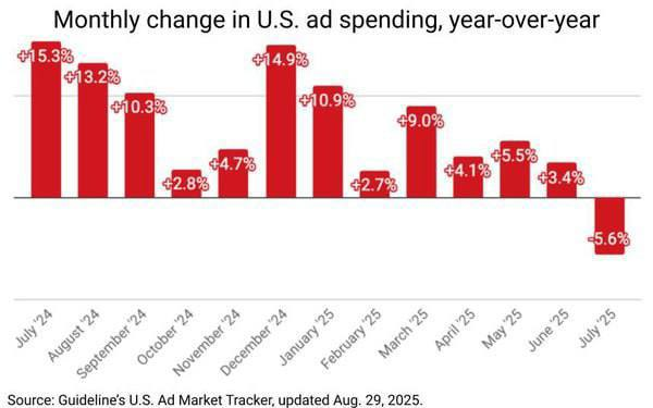 🤓Во всем виноват Трамп. В июле 2025 года в США на рекламном рынке впервые за 22 месяца был зафиксирован спад. Расходы на рекламу сократились на 5,6 % по сравнению с июлем 2024 года, отмечает Guideline's U.S. Ad Market Tracker.