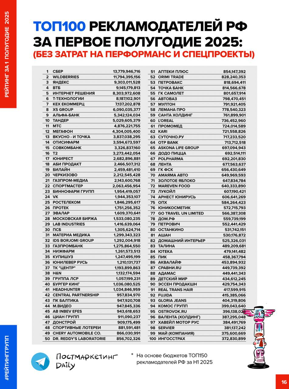 🤓Бюджеты ТОП100 клиентов РФ за первое полугодие 2025 года.