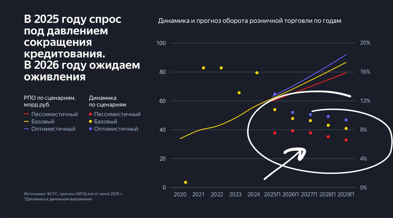 Выше — прогнозы со страниц слайдов того же Infoline. Как видим, во всех сценариях динамика роста оборота в ритейле падает год от года. Прошли, значит, зону роста.