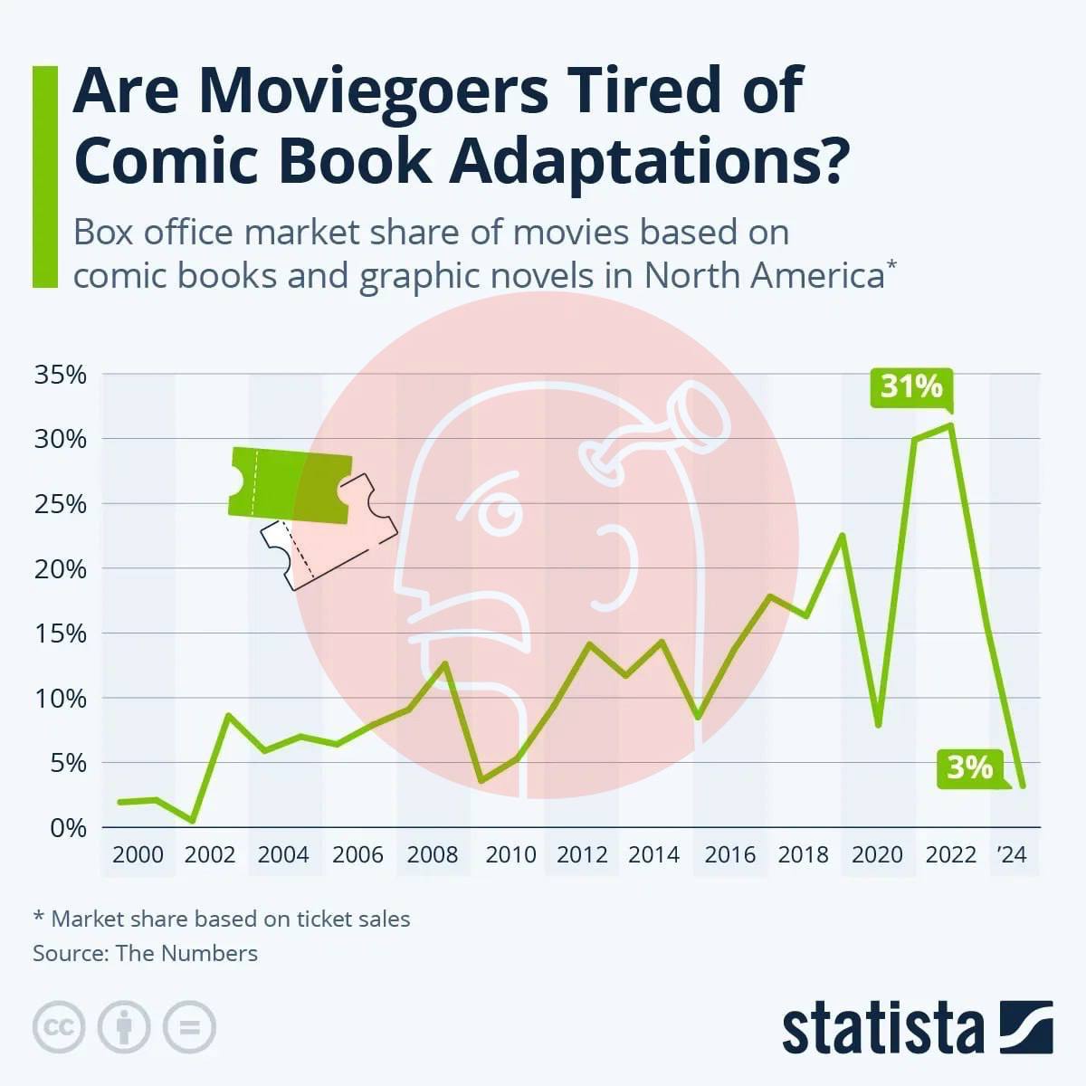 π€ΠΠΎΠ»Ρ ΡΠΈΠ»ΡΠΌΠΎΠ² ΠΏΠΎ ΠΊΠΎΠΌΠΈΠΊΡΠ°ΠΌ Π² ΡΠ΅Π²Π΅ΡΠΎΠ°ΠΌΠ΅ΡΠΈΠΊΠ°Π½ΡΠΊΠΎΠΌ ΠΏΡΠΎΠΊΠ°ΡΠ΅ ΡΠ΅Π·ΠΊΠΎ ΡΠΏΠ°Π»Π° Ρ ΠΏΠΈΠΊΠ° Π² 31% Π² 2022 Π³ΠΎΠ΄Ρ Π΄ΠΎ Π²ΡΠ΅Π³ΠΎ 3% Π² 2024-ΠΌ, ΡΡΠΎ ΠΌΠΎΠΆΠ΅Ρ ΡΠ²ΠΈΠ΄Π΅ΡΠ΅Π»ΡΡΡΠ²ΠΎΠ²Π°ΡΡ ΠΎ "ΡΡΠΏΠ΅ΡΠ³Π΅ΡΠΎΠΉΡΠΊΠΎΠΉ ΡΡΡΠ°Π»ΠΎΡΡΠΈ" Π·ΡΠΈΡΠ΅Π»Π΅ΠΉ ΠΏΠΎΡΠ»Π΅ Π·ΠΎΠ»ΠΎΡΠΎΠ³ΠΎ Π΄Π΅ΡΡΡΠΈΠ»Π΅ΡΠΈΡ Marvel ΠΈ DC.