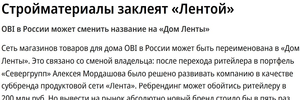 OBI/Лента — три дня назад — в Постмаркетинге, потом — репосты в десятках каналов про ритейл, сегодня — в Коммерсанте.