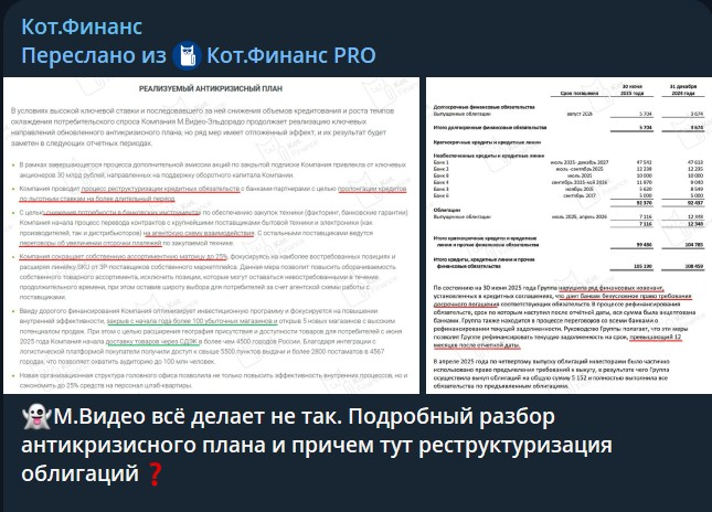 Фактически это перевод поставщиков на агентскую схему, что указано в антикризисном плане М.Видео. Почему это тупик — подробно в обзоре Кот Финанс. Он, кстати, рекомендует продавать.
