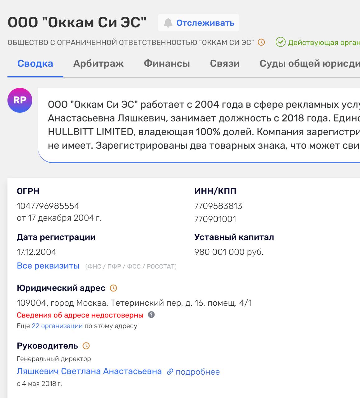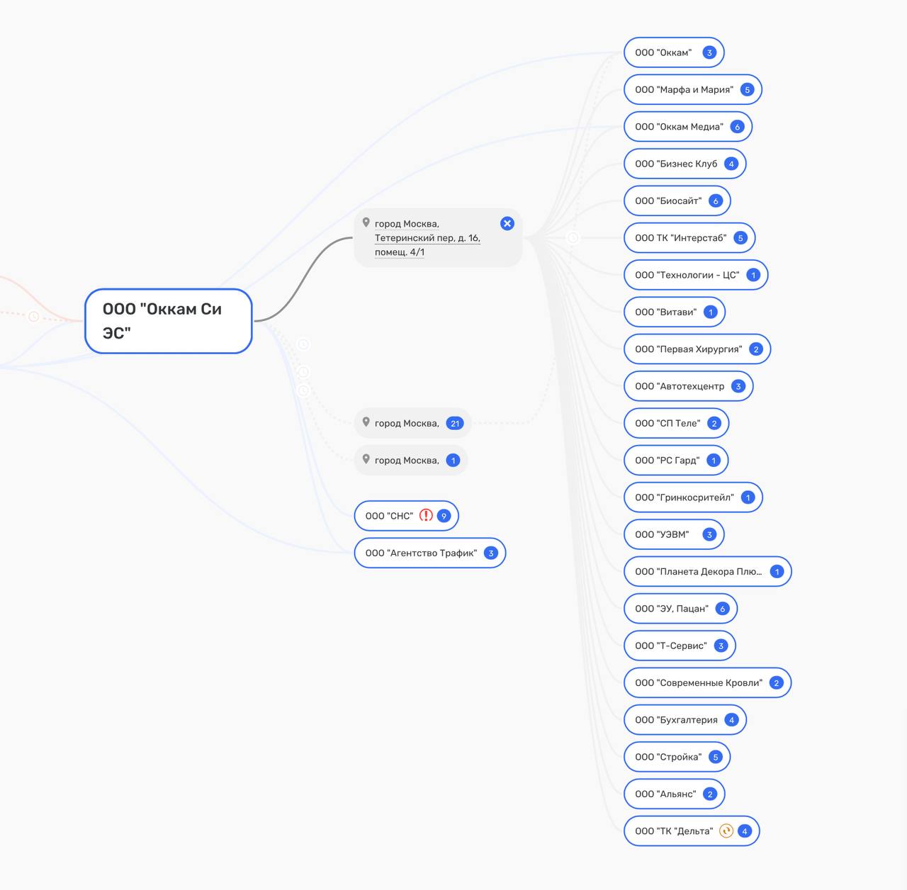 😬Основному юрлицу ОККАМА повесили метку «Сведения об адресе недостоверны» в ЕГРЮЛ. И действительно, соседями по месту регистрации компании являются десятки самых странных юрлиц. Похоже на массовый адрес.
