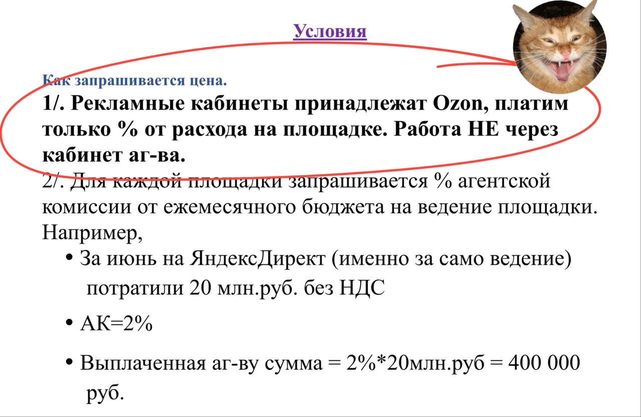 😂Забавная оговорка в тендере Озона на диджиталку. Кажется, в 25 году 21 века у агентств хватает слабоумия и отваги заливать даже Озону в уши сказку «работаем на своих кабинетах, вам покажем скрины и дашборды, потому что там у нас другие клиенты заведены и спец условия подключены…».