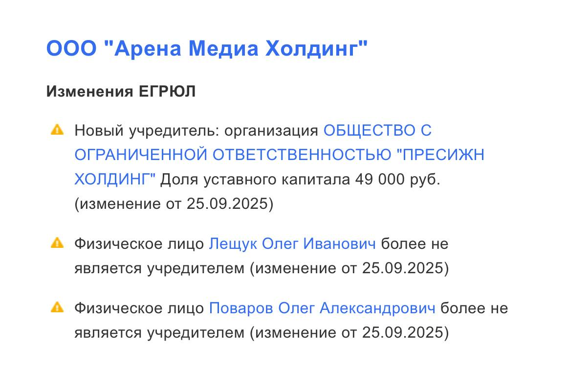 1. ООО «Арена медиа холдинг» сменил владельца, из общества вышли господа Лещук и Поваров.