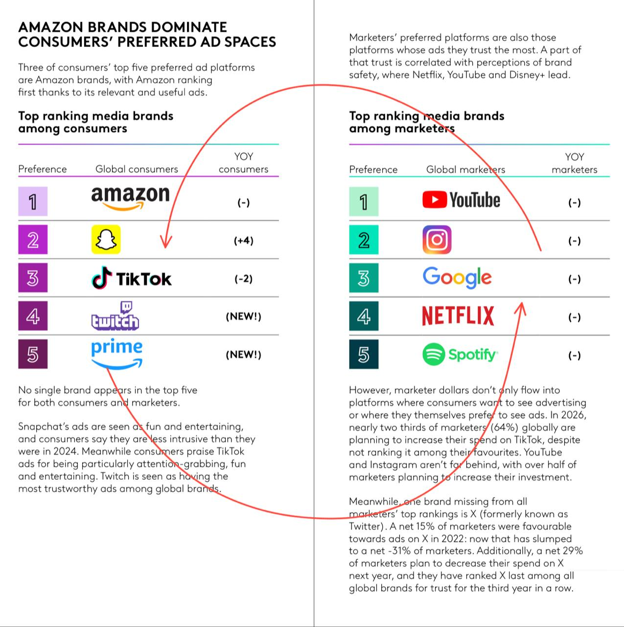 Платформы, на которых маркетологи предпочитают размещать рекламу, отличаются на 100% от тех, на которых потребители предпочитают видеть рекламу.