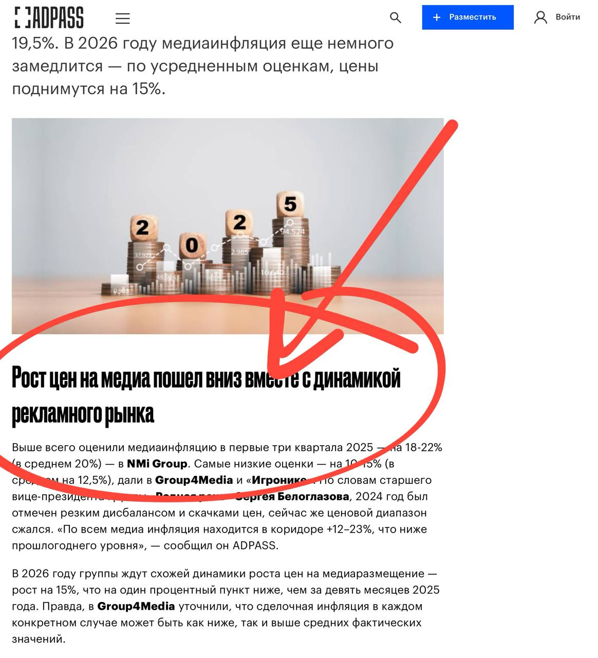 🤓Курица или яйцо? Коллеги их Адпасс делятся удивительным выводом в обзорной статье по прогнозам на 2026 год: «Рост цен на медиа пошел вниз вместе с динамикой рекламного рынка».