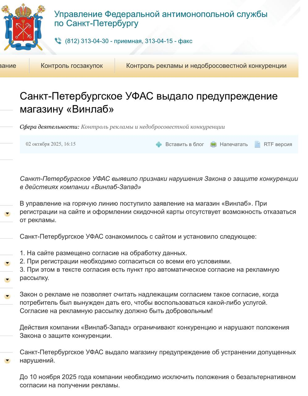 🥰Доблестное УФАС по СПб поймало Винлаб на принудительной рассылке рекламы всем участникам программы лояльности и предписало это безобразие прекратить. Ура!