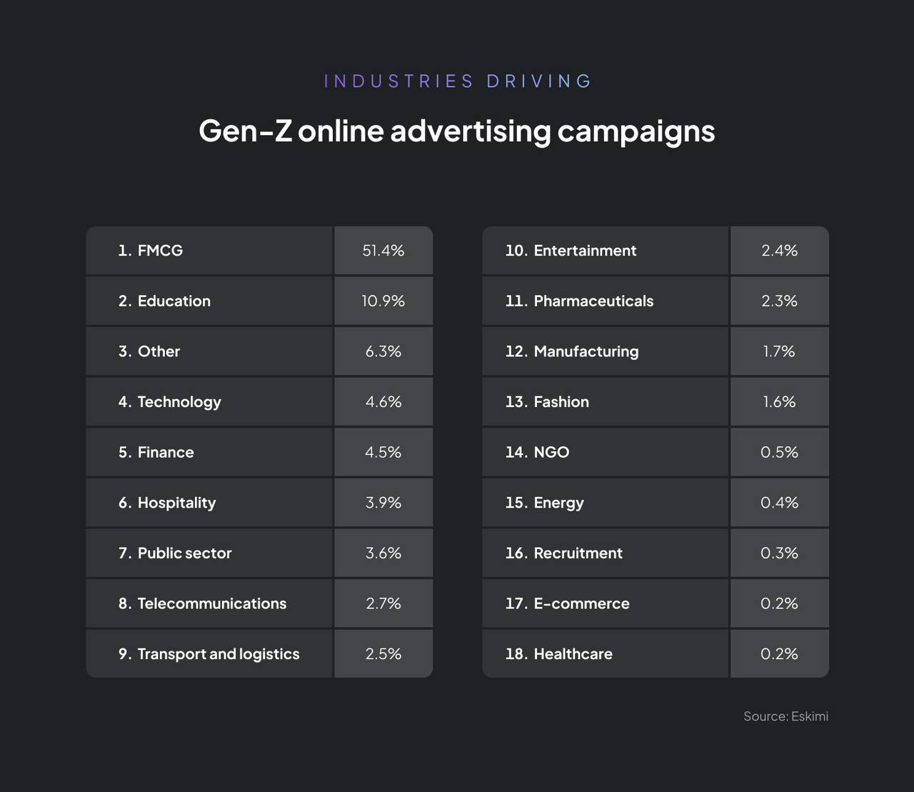 Основными драйверами в стали бренды FMCG (85% всех кампаний), за ними следуют мода (8%) и фармацевтика (5%).