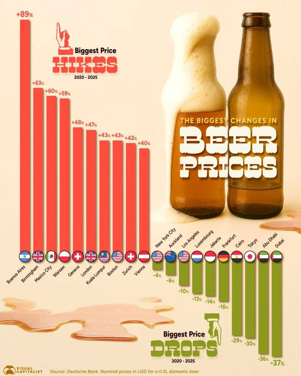 Единственное место, где пиво заметно подешевело это Дубай, где цены упали на 37% после отмены 30% налога на алкоголь.