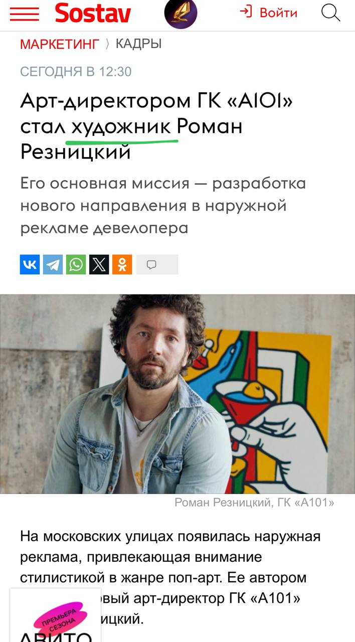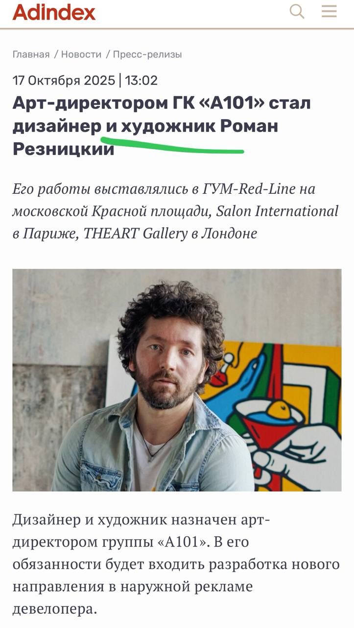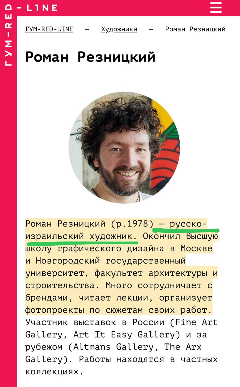 🤔Еще год назад ГУМ называл Резницкого «русско-израильским художником». Сегодня А101 скромно именует его просто художником.