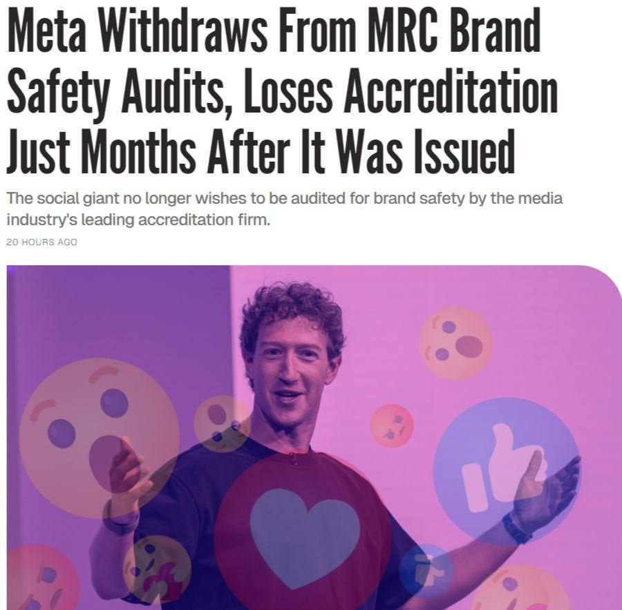 🤔Meta* потеряла аккредитацию по безопасности бренда от Совета по медиарейтингам (MRC) и вышла из программы аудитов, менее чем через четыре месяца после её получения.